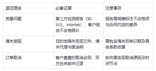 高频退运理由及举证要点: